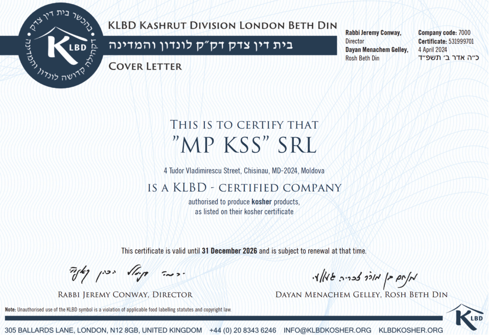 Nuestros productos están certificados por KLBD con el derecho anual a utilizar el logotipo Kosher.